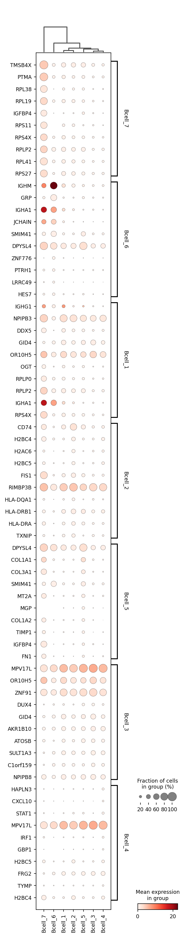 sc.pl.rank_genes_groups_dotplot(adata_domains, n_genes=10, show=False)