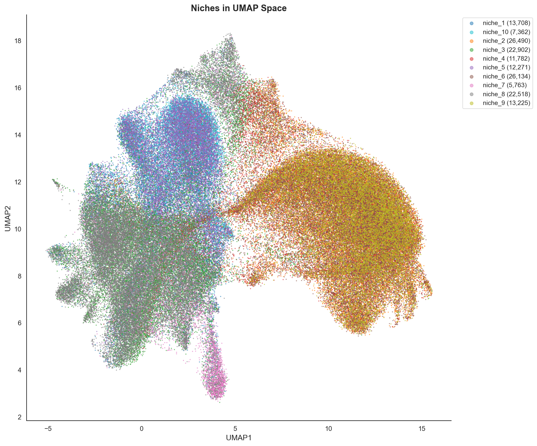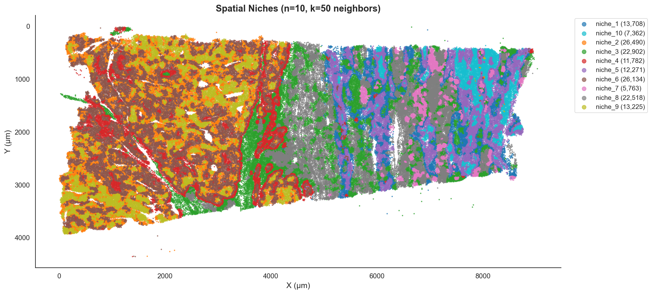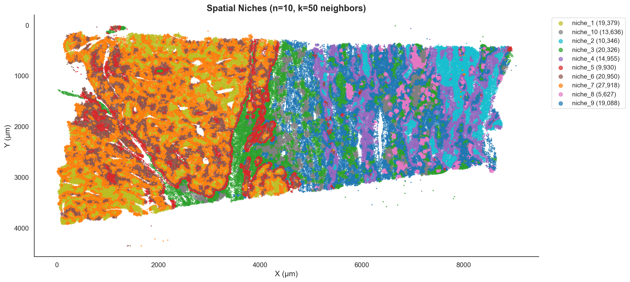 The identified niches map to distinct, biologically coherent regions of the tissue. Notice how Niche 10 (yellow) highlights the interface between the tumor and the immune-rich regions.