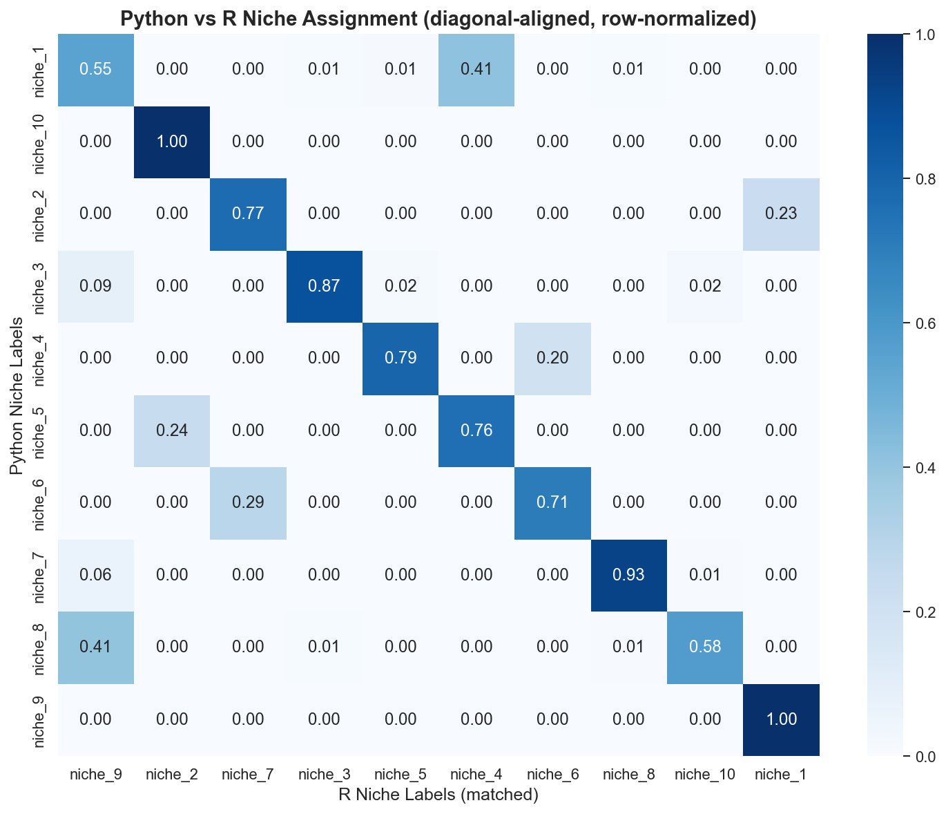 Side-by-side comparison of spatial niche assignments demonstrates strong biological concordance between implementations.