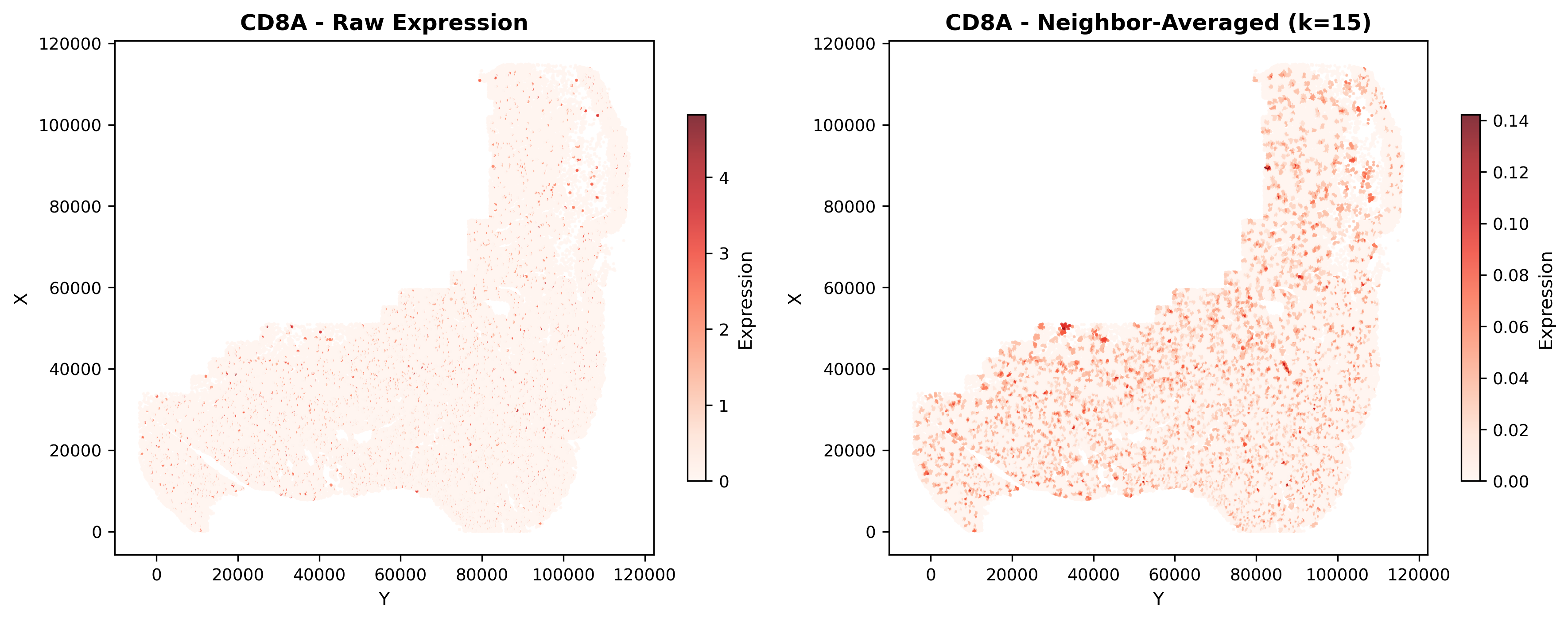 Left: Raw expression (noisy, scattered). Right: Neighbor-averaged expression (smooth spatial patterns emerge).