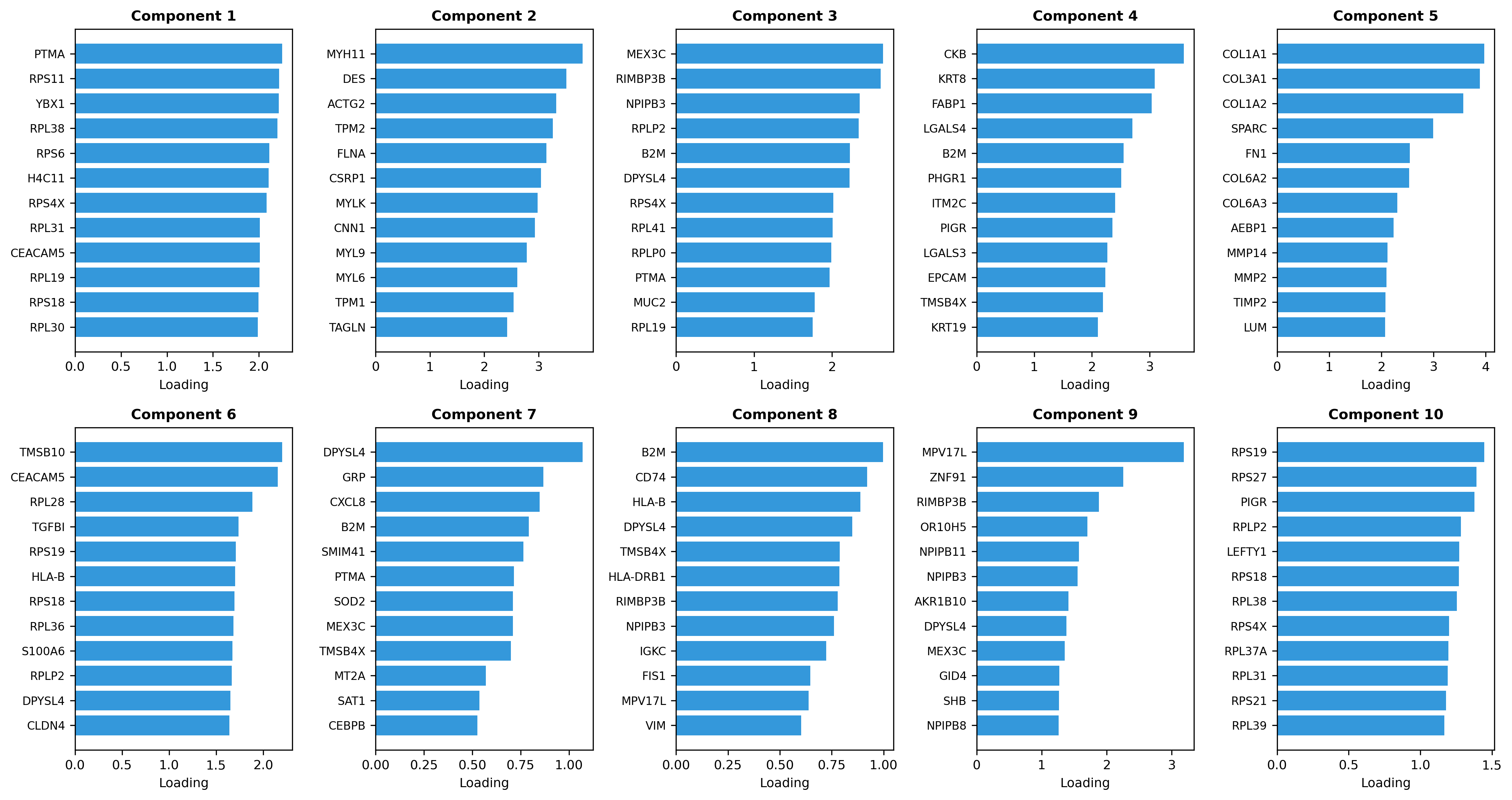 What it shows: The highest-loading genes per component.