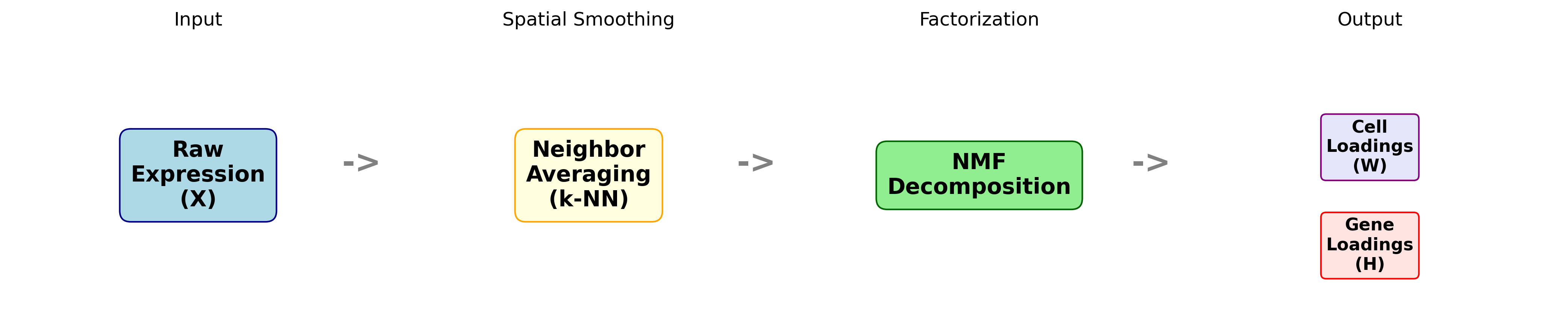 Math: Neighbor averaging: \(\bar{X} = W \cdot X\) where \(W\) is a sparse, row-normalized neighbor matrix. NMF decomposition: \(\bar{X} \approx C \cdot G^T\) where \(C\) = cell loadings, \(G\) = gene loadings.